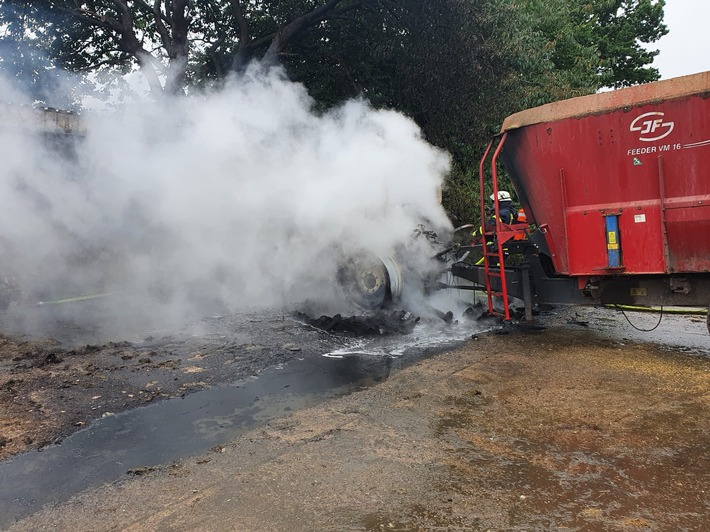 Schönhorst, Kreis Rendsburg-Eckernförde. Am heutigen Sonntag, 29.08.2021, um 9:36 Uhr wurden die Freiwilligen Feuerwehren Schönhorst und Flintbek zu einem brennenden Traktor auf dem Gelände eines landwirtschaftlichen Betriebes alarmiert. Als die Einstzkräfte eintrafen, brannte das Fahrzeug bereits in voller Ausdehnung. Die Einsatzkräfte löschten den Brand unter Atemschutz und verhinderten die Ausbreitung auf einen angrenzenden Unterstand und den am Traktor angekuppelten Anhänger. Vor Ort waren neben 30 Einsatzkräften der Feuerwehr ein Rettungswagen und die Polizei. Bei der Ursache ist von einem technischen Defekt auszugehen. Die Schadenssumme beläuft sich auf mehrere Zehntausend Euro.