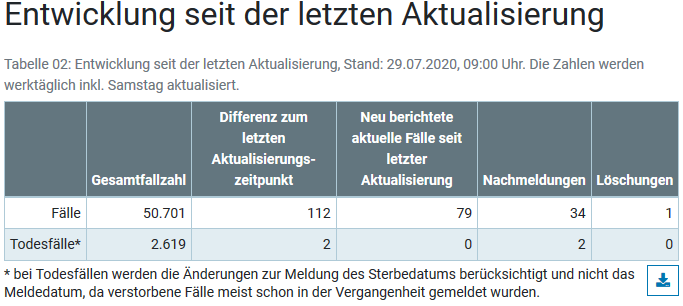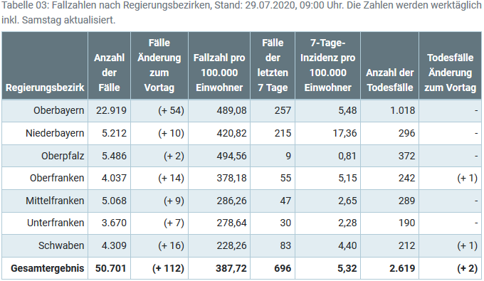 Tabelle 01: Coronavirusinfektionen, Stand: 29.07.2020, 09:00 Uhr. Die Zahlen werden werktäglich inkl. Samstag aktualisiert.