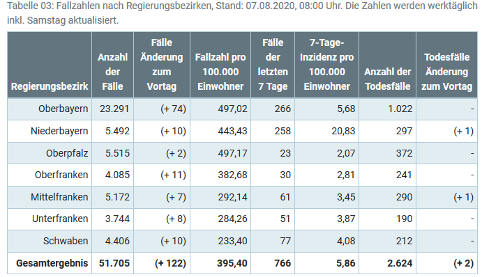Von der Gesamtzahl der Fälle in Bayern (s. o.) gelten 47.530 als genesen. Die Anzahl der Genesenen beruht auf einer Schätzung, die sich an den Kriterien des RKI orientiert. Fälle gelten als genesen, wenn kein Tod eingetreten ist und