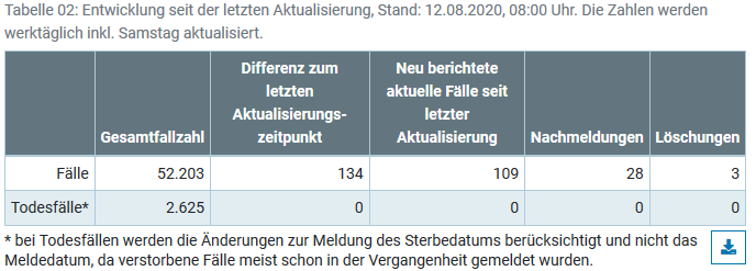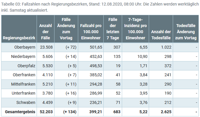 Tabelle 01: Coronavirusinfektionen, Stand: 12.08.2020, 08:00 Uhr. Die Zahlen werden werktäglich inkl. Samstag aktualisiert.