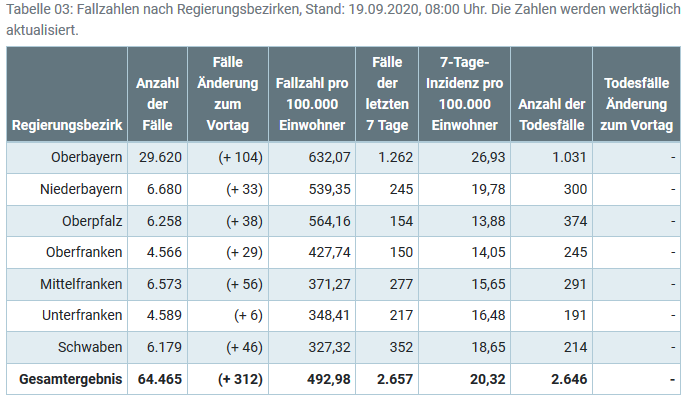 Von der Gesamtzahl der Fälle in Bayern (s. o.) gelten 56.160 als genesen. Die Anzahl der Genesenen beruht auf einer Schätzung, die sich an den Kriterien des RKI orientiert. Fälle gelten als genesen, wenn kein Tod eingetreten ist und
