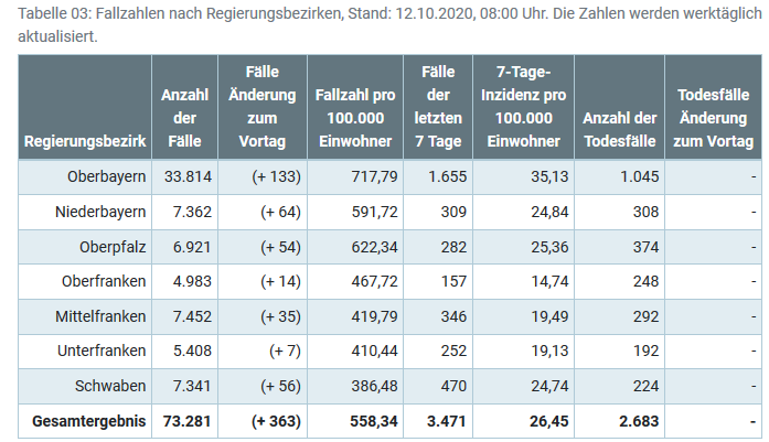 Von der Gesamtzahl der Fälle in Bayern (s. o.) gelten 64.160 als genesen. Die Anzahl der Genesenen beruht auf einer Schätzung, die sich an den Kriterien des RKI orientiert. Fälle gelten als genesen, wenn kein Tod eingetreten ist und