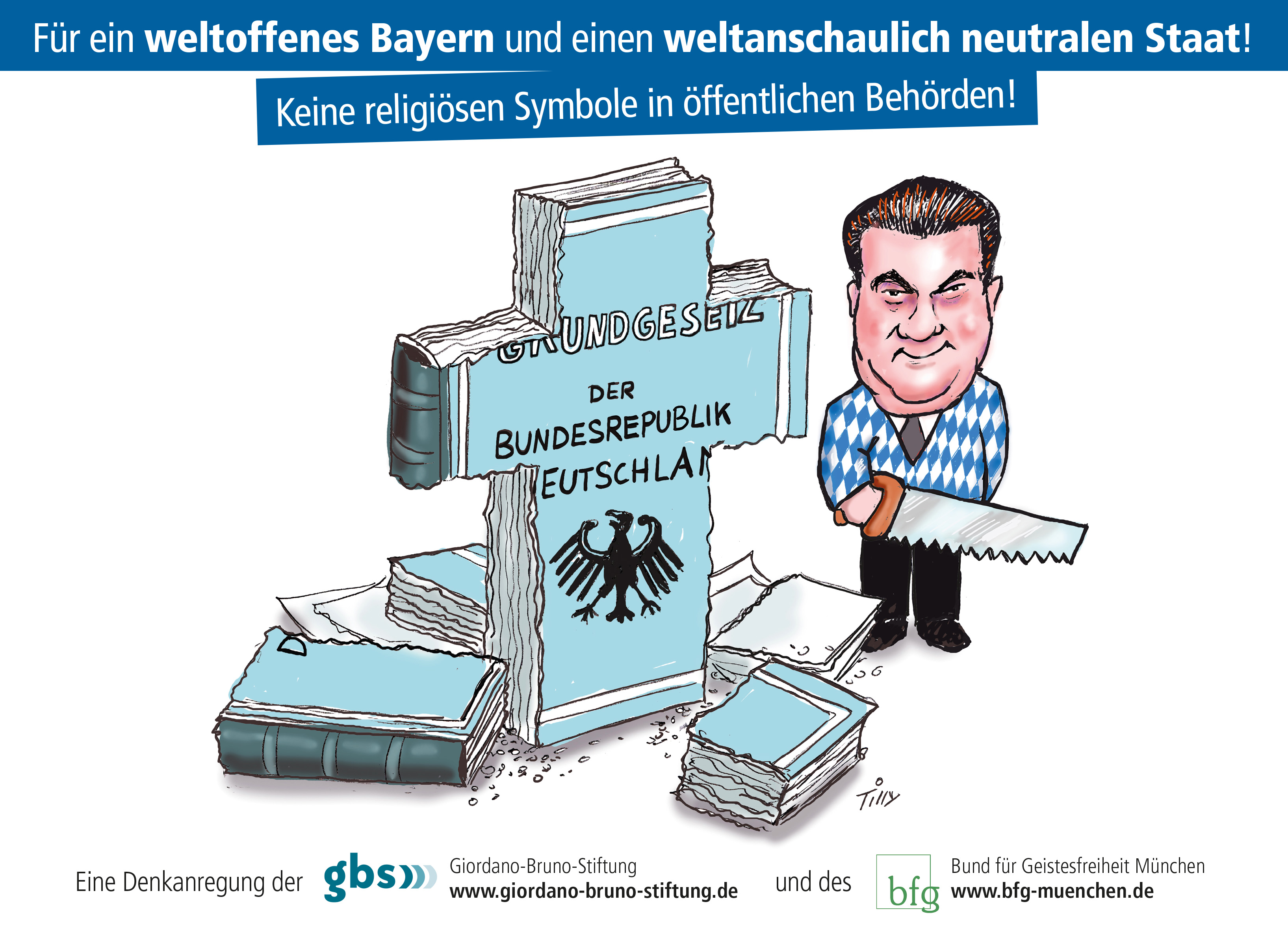 München (ots) – Pünktlich zum Inkrafttreten der neuen Kreuz-Verordnung in Bayern am Freitag, dem 1. Juni 2018, veranstalten die Giordano-Bruno-Stiftung (gbs) und der Bund für Geistesfreiheit (bfg) einen „Aktionstag für ein weltoffenes Bayern und einen weltanschaulich neutralen Staat“. Der Düsseldorfer Künstler Jacques Tilly hat hierzu eine Karikatur von Markus Söder gezeichnet, der mit einer Säge das deutsche Grundgesetzbuch auf Kreuzform zurückgeschnitten hat. Am Wochenende wird das Söder-Plakat in München vielerorts zu sehen sein.