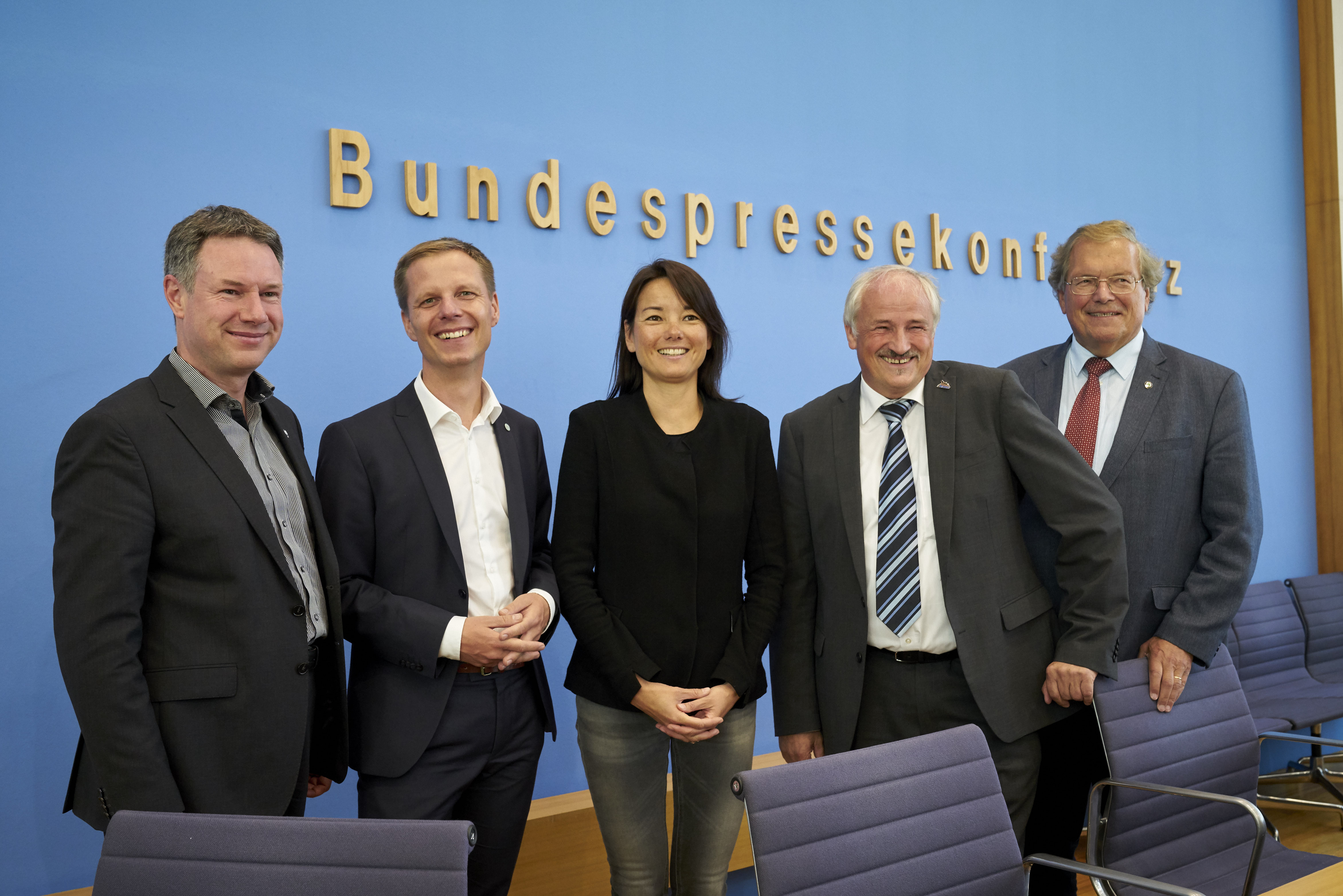 Christoph Heinrich (WWF), Kai Niebert (DNR), Sweelin Heuss (Greenpeace), Olaf Tschimpke (NABU) und Hubert Weiger (BUND). Berlin 05.09.17; Die Umweltverbaende Greenpeace, BUND, NABU, WWF und der Deutsche Naturschutzring (DNR) stellen auf einer gemeinsamen Pressekonferenz in Berlin vor der Bundestagswahl ihre Forderungen zum Thema „Großbaustelle …