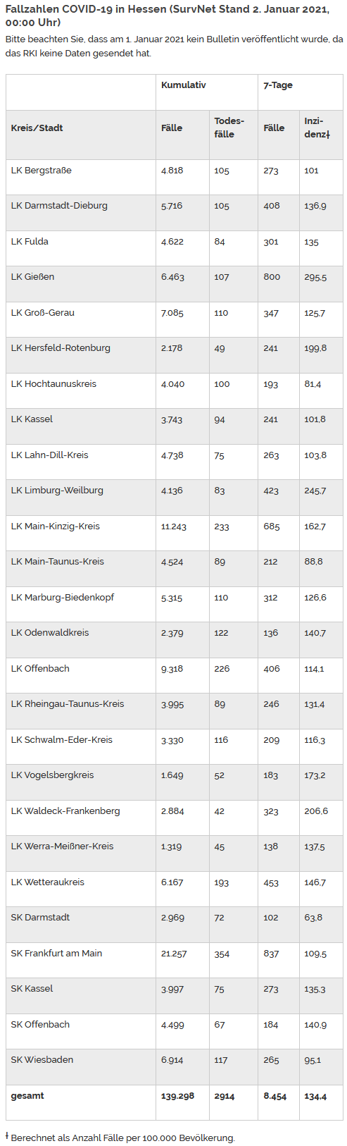 Bitte beachten Sie, dass die am 02.01.2021 versandte Morgenvorschau auf der Differenz zur letzten Vorschau am Abend des 31.12.2020 beruht, das Bulletin jedoch auf der Differenz zum letzten versandten Bulletin am 31.12.2020 morgens. Durch das Aussetzen der Datenlieferung des RKI und darauf folgend unserer Berichterstattung am Neujahrstag ist die Berichterstattung am Folgetag leider nicht einheitlich. Der Frühbericht nennt einen Zuwachs von 962 Fällen, das Bulletin einen Zuwachs von 2.791 Fällen. Im heutigen Bulletin gibt es bei der Aufgliederung nach Landkreisen und kreisfreien Städten in Tabelle 1 eine kleinere Abweichung von 70 Fällen nach unten im Vergleich zur berichteten Gesamtfallzahl. Hier muss noch eine Bereinigung erfolgen.