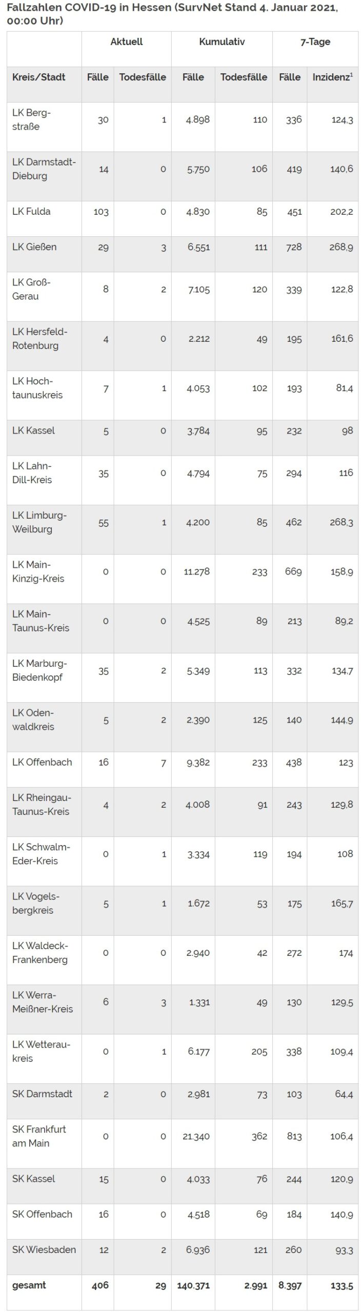 Die kumulierte Inzidenz umfasst alle bisher gemeldeten bestätigten Fälle in Hessen pro 100.000 Einwohner und die 7-Tage-Inzidenz beschreibt alle bestätigten Fälle der vorangegangenen sieben Tage in Hessen pro 100.000 Einwohner. Für die Berechnung der Inzidenzen werden die Bevölkerungszahlen des Hessischen Statistischen Landesamtes in Wiesbaden (Stand: 31.03.2020) zugrunde gelegt. Bei den Inzidenzberechnungen kann es zu Abweichungen kommen, da das RKI geringfügig abweichende Bevölkerungszahlen zugrunde legt.