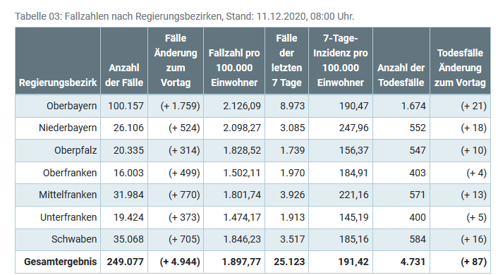 Übersicht der Fallzahlen von Coronavirusinfektionen in Bayern