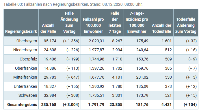 Übersicht der Fallzahlen von Coronavirusinfektionen in Bayern