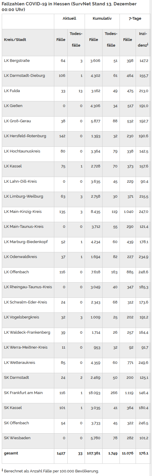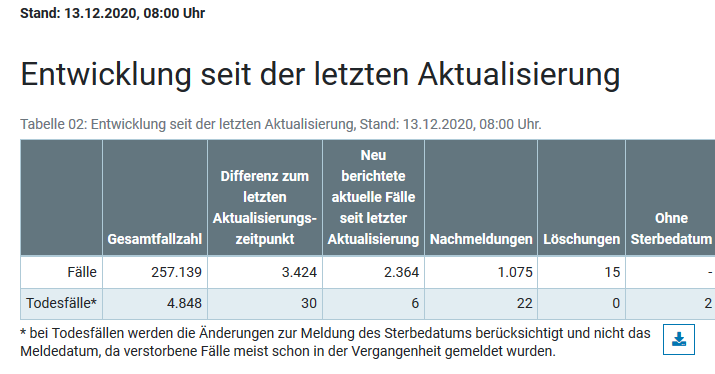 Am Sonntag, 13. Dezember 2020, hat das Landesgesundheitsamt (LGA) Baden-Württemberg insgesamt weitere 2.277 bestätigte Infektionen mit dem Coronavirus gemeldet (Stand: 16.00 Uhr, siehe Tabelle im Tagesbericht COVID-19 (PDF)). Damit steigt die Zahl der seit Beginn der Pandemie Infizierten in Baden-Württemberg auf mindestens 188.233 an. Davon sind ungefähr 133.030 (+2.140) Personen bereits wieder von ihrer Covid-19-Erkrankung genesen. Derzeit sind geschätzt 51.779 (+112) Menschen im Land mit dem Coronavirus (SARS-CoV-2) infiziert.