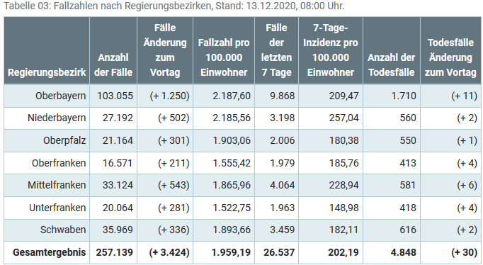 Übersicht der Fallzahlen von Coronavirusinfektionen in Bayern