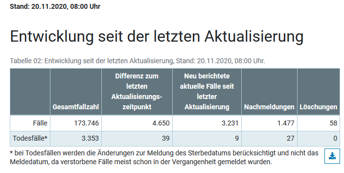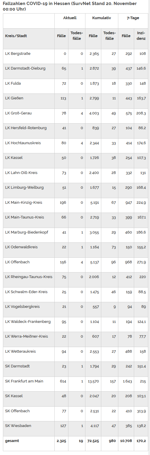COVID-19: Fallzahlen Baden-Württemberg, Bayern, Hessen – Stand 20.11.2020