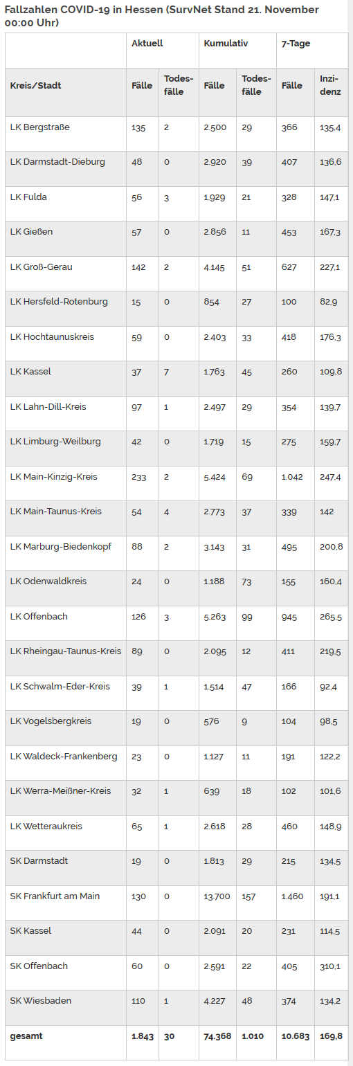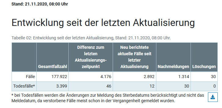 Am Samstag, 21. November 2020, hat das Landesgesundheitsamt (LGA) Baden-Württemberg insgesamt weitere 2.112 bestätigte Infektionen mit dem Coronavirus gemeldet (Stand: 16.00 Uhr, siehe Tabelle im Tagesbericht COVID-19 (PDF)). Damit steigt die Zahl der seit Beginn der Pandemie Infizierten in Baden-Württemberg auf mindestens 132.004 an. Davon sind ungefähr 84.722 (+2.104) Personen bereits wieder von ihrer Covid-19-Erkrankung genesen. Derzeit sind geschätzt 44.842 (+3) Menschen im Land mit dem Coronavirus (SARS-CoV-2) infiziert.