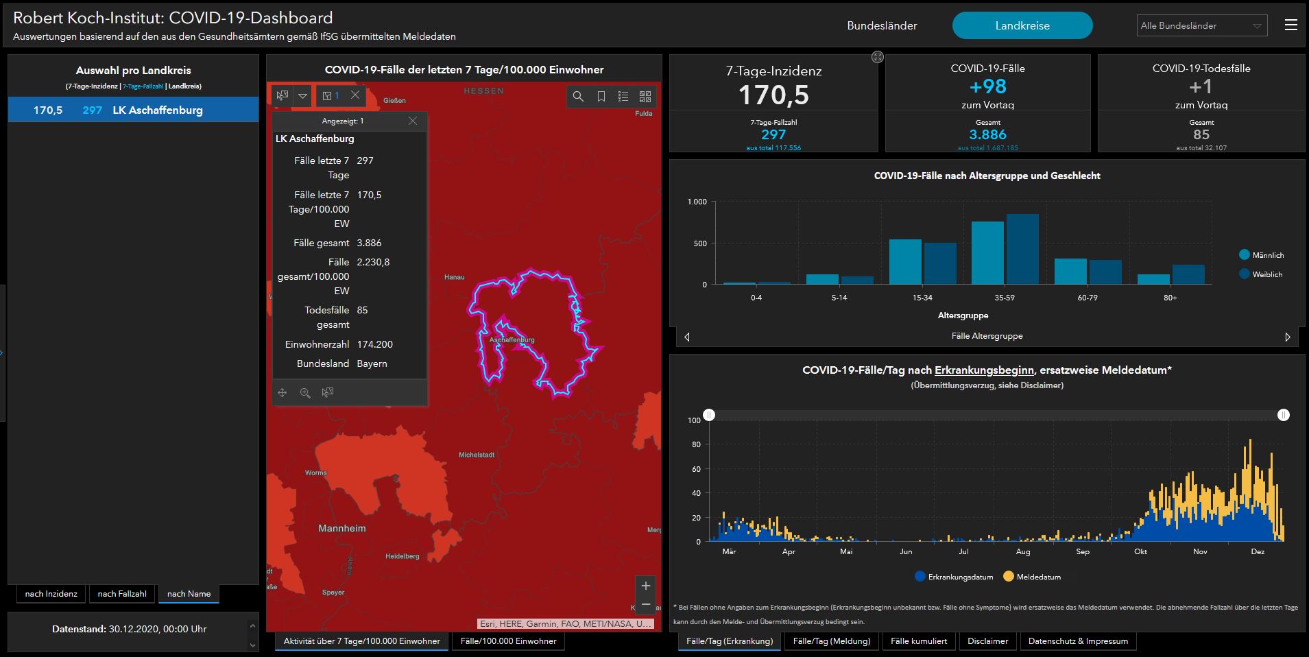 COVID-19 Fallzahlen: Landkreise Main-Spessart, Miltenberg, Aschaffenburg, Würzburg, Neckar-Odenwald und Hohenlohe Stand 30.12.2020