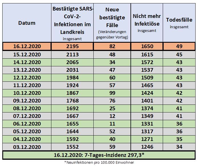 COVID-19: Fallzahlen Landkreise Main-Spessart, Miltenberg, Würzburg und Neckar-Odenwald-Kreis – Stand 16.12.2020