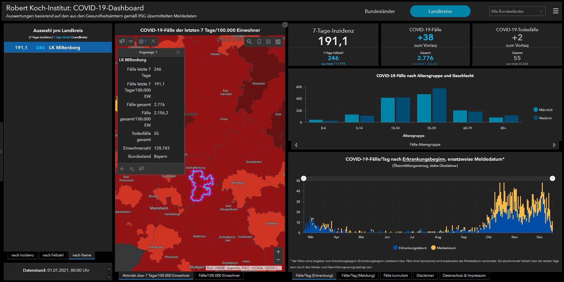 COVID-19 Fallzahlen: Landkreise Würzburg, Main-Spessart, Miltenberg, Aschaffenburg, Neckar-Odenwald und Hohenlohe Stand 01.01.2021