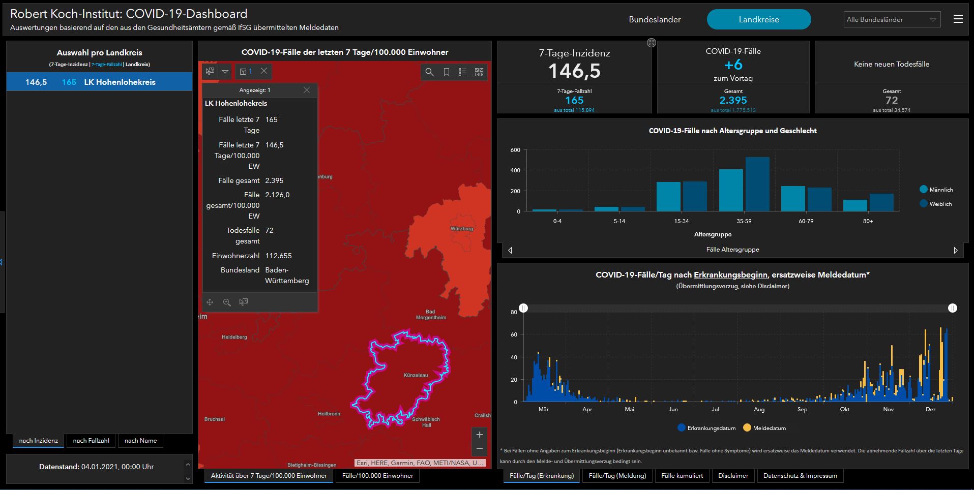 Im Hohenlohekreis wurden am 3. Januar 2021 insgesamt 6 neue Corona-Fälle gemeldet. Die 7-Tage-Inzidenz liegt bei 146,5 pro 100.000 Einwohner.