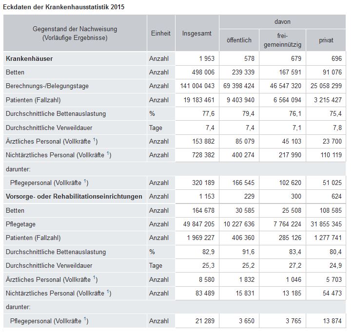 WIESBADEN – Im Jahr 2015 wurden 19,2 Millionen Patientinnen und Patienten stationär im Krankenhaus behandelt, 34 800 Behandlungsfälle oder 0,2 % mehr als im Jahr zuvor. Wie das Statistische Bundesamt (Destatis) nach vorläufigen Ergebnissen weiter mitteilt, dauerte der Aufenthalt im Krankenhaus wie im Vorjahr durchschnittlich 7,4 Tage.