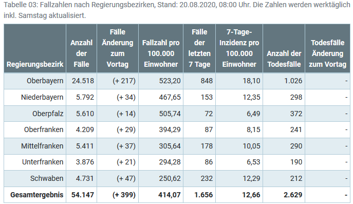 Von der Gesamtzahl der Fälle in Bayern (s. o.) gelten 48.870 als genesen. Die Anzahl der Genesenen beruht auf einer Schätzung, die sich an den Kriterien des RKI orientiert. Fälle gelten als genesen, wenn kein Tod eingetreten ist und