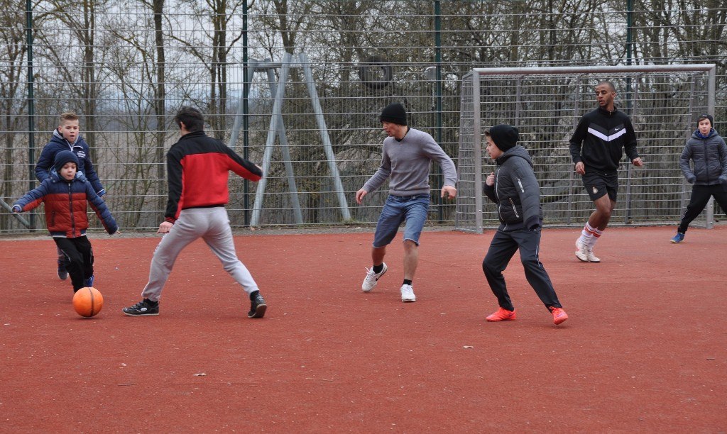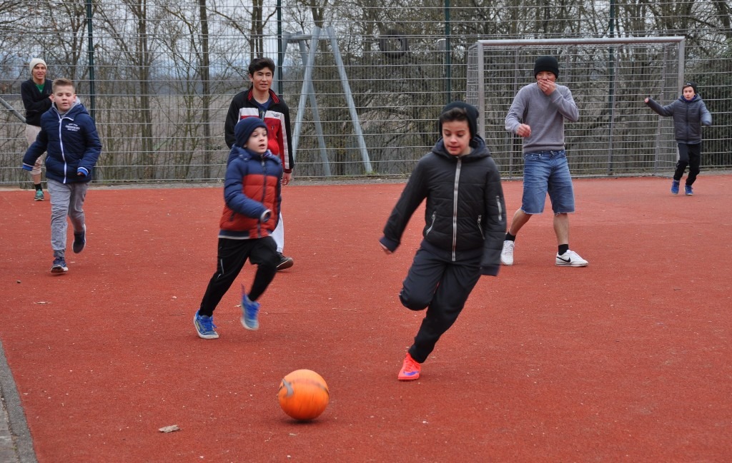 So geht das jetzt schon seit Tagen: Fußballbegeisterte aus der Lea Wertheim und aus dem Stadtteil toben nachmittags miteinander über den Freizeitplatz nahe der Grundschule Reinhardshof. Auch heute ergab sich das Zusammenspiel wieder ganz unkompliziert: