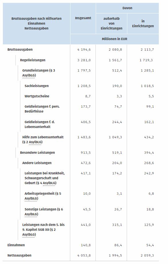 Aufgeschlüsselt nach den einzelnen Paragrafen des AsylbLG entfielen von den insgesamt 4,2 Milliarden Euro staatlicher Bruttoausgaben für Asylbewerberleistungen 1,8 Milliarden Euro (-3,6 %) auf die Grundleistungen nach § 3 AsylbLG. Für Hilfen zum Lebensunterhalt nach § 2 AsylbLG wurden 1,5 Milliarden Euro (-5,5 %) aufgewendet und für ebenfalls in § 2 AsylbLG geregelte Leistungen nach den Kapiteln 5 bis 9 des SGB XII 441,0 Millionen Euro (0,9 %). In die Leistungen bei Krankheit, Schwangerschaft und Geburt (§ 4 AsylbLG) flossen 417,1 Millionen Euro (-12,0 %) und in die Arbeitsgelegenheiten (§ 5 AsylbLG) sowie die Sonstigen Leistungen (§ 6 AsylbLG) zusammen 55,5 Millionen Euro (-2,1 %).