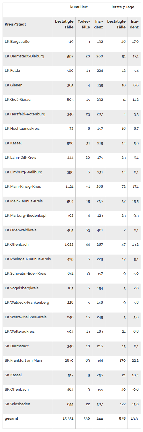 Es wurden, Stand 29. August 2020, 14:00 Uhr, in Hessen insgesamt 15.351 SARS-CoV-2-Fälle bestätigt.
