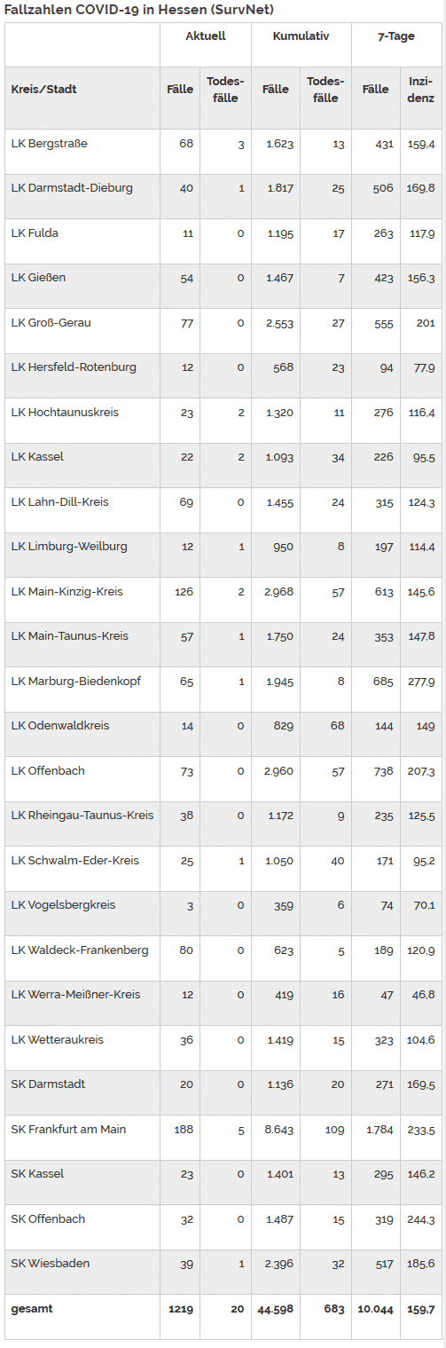 Die kumulierte Inzidenz umfasst alle bisher gemeldeten bestätigten Fälle in Hessen pro 100.000 Einwohner und die 7-Tage-Inzidenz beschreibt alle bestätigten Fälle der vorangegangenen sieben Tage in Hessen pro 100.000 Einwohner. Für die Berechnung der Inzidenzen werden die Bevölkerungszahlen des Hessischen Statistischen Landesamtes in Wiesbaden (Stand: 31.03.2020) zugrunde gelegt. Bei den Inzidenzberechnungen kann es zu Abweichungen kommen, da das RKI geringfügig abweichende Bevölkerungszahlen zugrunde legt.