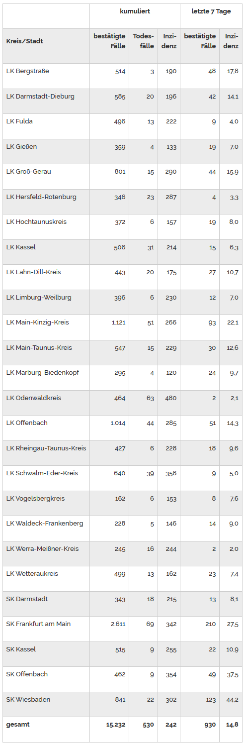 Es wurden, Stand 28. August 2020, 14:00 Uhr, in Hessen insgesamt 15.232 SARS-CoV-2-Fälle bestätigt.