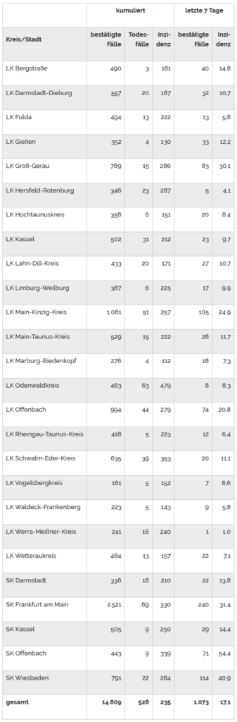 Es wurden, Stand 25. August 2020, 14:00 Uhr, in Hessen insgesamt 14.809 SARS-CoV-2-Fälle bestätigt.