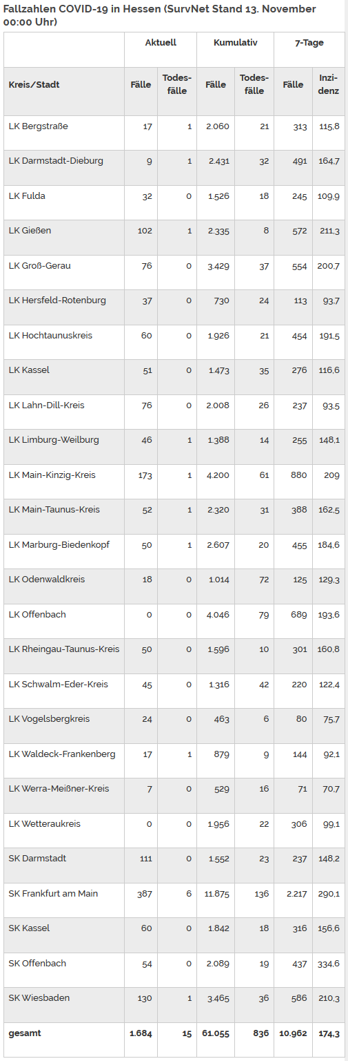 Die kumulierte Inzidenz umfasst alle bisher gemeldeten bestätigten Fälle in Hessen pro 100.000 Einwohner und die 7-Tage-Inzidenz beschreibt alle bestätigten Fälle der vorangegangenen sieben Tage in Hessen pro 100.000 Einwohner. Für die Berechnung der Inzidenzen werden die Bevölkerungszahlen des Hessischen Statistischen Landesamtes in Wiesbaden (Stand: 31.03.2020) zugrunde gelegt. Bei den Inzidenzberechnungen kann es zu Abweichungen kommen, da das RKI geringfügig abweichende Bevölkerungszahlen zugrunde legt.