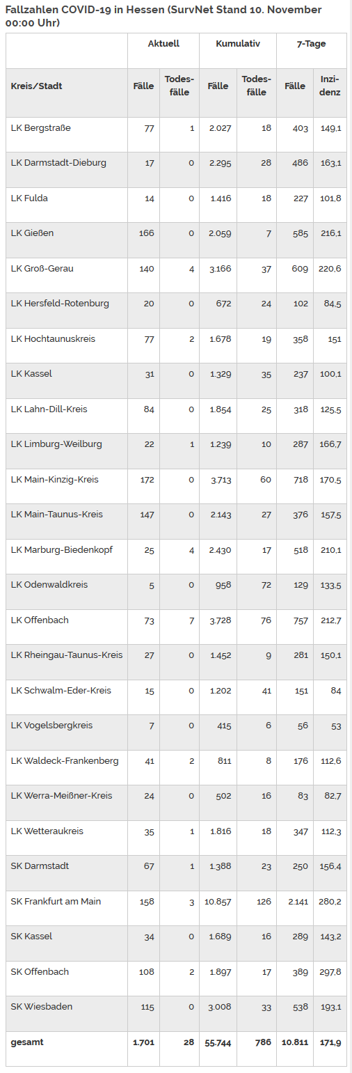 Hessen: 1701 neue Coronavirus Infektionen – 28 Todesfälle – 7-Tage-Inzidenz 171,9 – Aktueller Stand 10.11.2020 – Wichtige Informationen