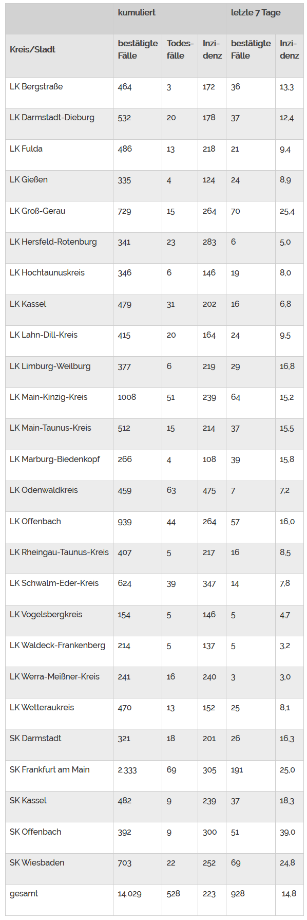 Es wurden, Stand 20. August 2020, 14:00 Uhr, in Hessen insgesamt 14.029 SARS-CoV-2-Fälle bestätigt.