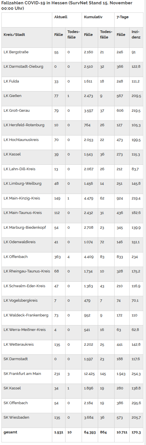 Die kumulierte Inzidenz umfasst alle bisher gemeldeten bestätigten Fälle in Hessen pro 100.000 Einwohner und die 7-Tage-Inzidenz beschreibt alle bestätigten Fälle der vorangegangenen sieben Tage in Hessen pro 100.000 Einwohner. Für die Berechnung der Inzidenzen werden die Bevölkerungszahlen des Hessischen Statistischen Landesamtes in Wiesbaden (Stand: 31.03.2020) zugrunde gelegt. Bei den Inzidenzberechnungen kann es zu Abweichungen kommen, da das RKI geringfügig abweichende Bevölkerungszahlen zugrunde legt.