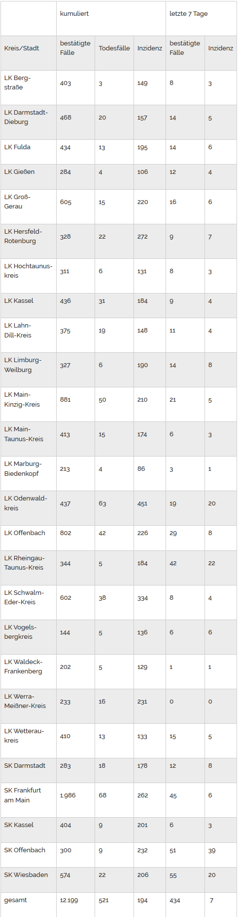 Die kumulierte Inzidenz umfasst alle bisher gemeldeten bestätigten Fälle in Hessen pro 100.000 Einwohner und die 7-Tage-Inzidenz beschreibt alle bestätigten Fälle der vorangegangenen sieben Tage in Hessen pro 100.000 Einwohner. Für die Berechnung der Inzidenzen werden die Bevölkerungszahlen des Hessischen Statistischen Landesamtes in Wiesbaden (Stand: 30.06.2019) zugrunde gelegt. Bei den Inzidenzberechnungen kann es zu Abweichungen kommen, da das RKI geringfügig abweichende Bevölkerungszahlen zugrunde legt.