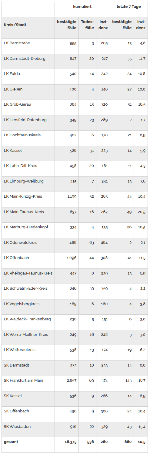 Es wurden, Stand 9. September 2020, 14:00 Uhr, in Hessen insgesamt 16.375 SARS-CoV-2-Fälle bestätigt.