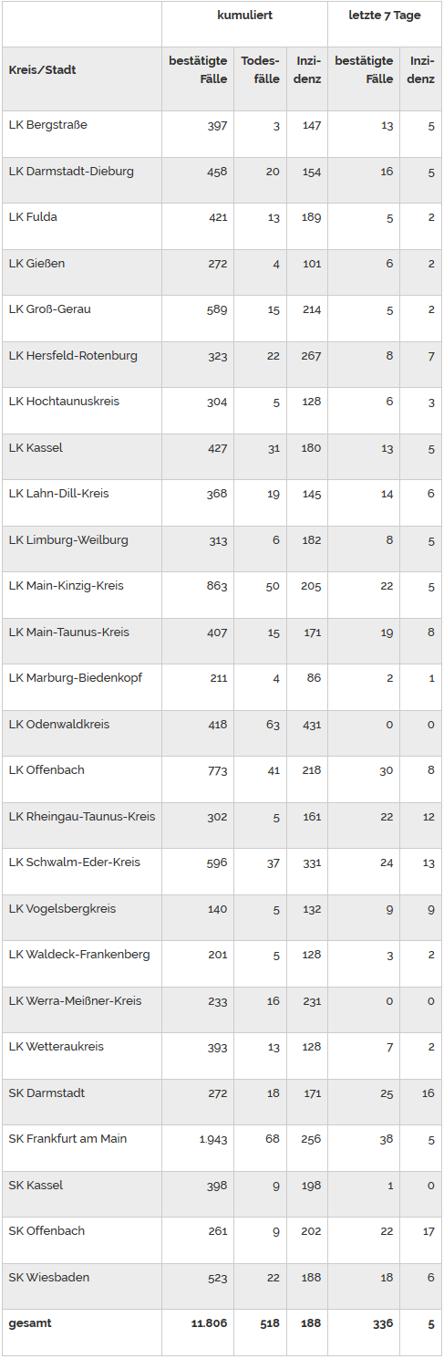 Es wurden, Stand 29. Juli 2020, 14:00 Uhr, in Hessen insgesamt 11.806 SARS-CoV-2-Fälle bestätigt.