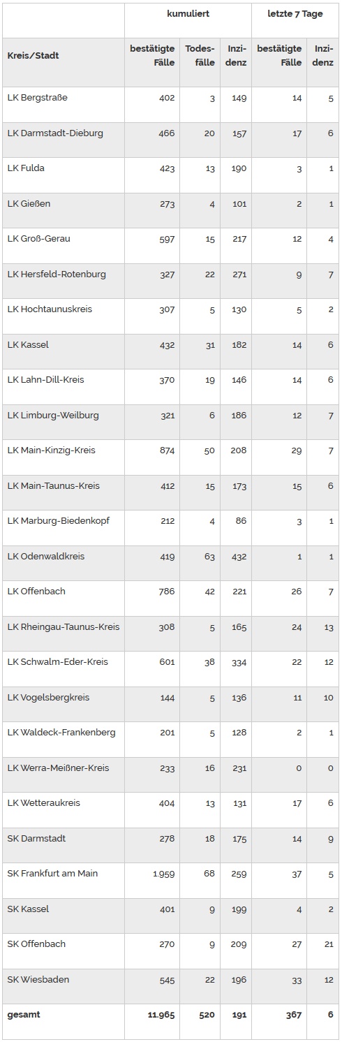 Es wurden, Stand 31. Juli 2020, 14:00 Uhr, in Hessen insgesamt 11.965 SARS-CoV-2-Fälle bestätigt.