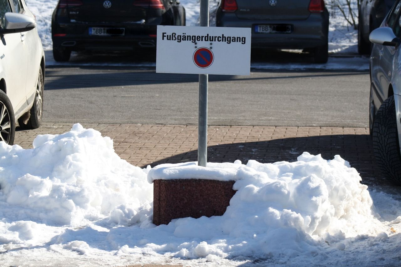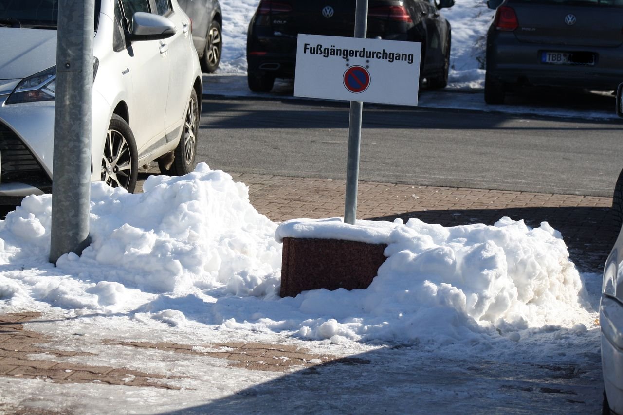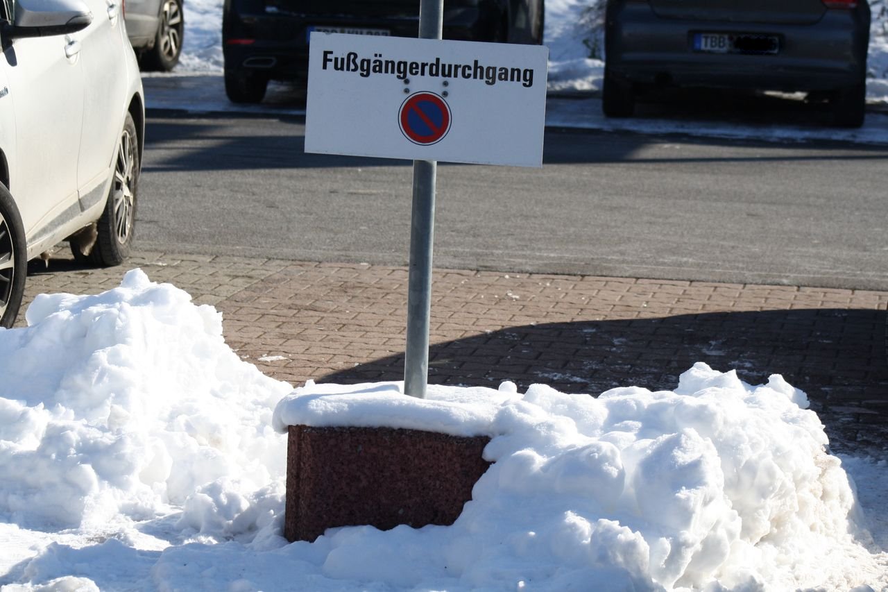 gesamte Schnee des Parkplatzes auf den einzigen Fußgängerüberweg verlagert wurde.