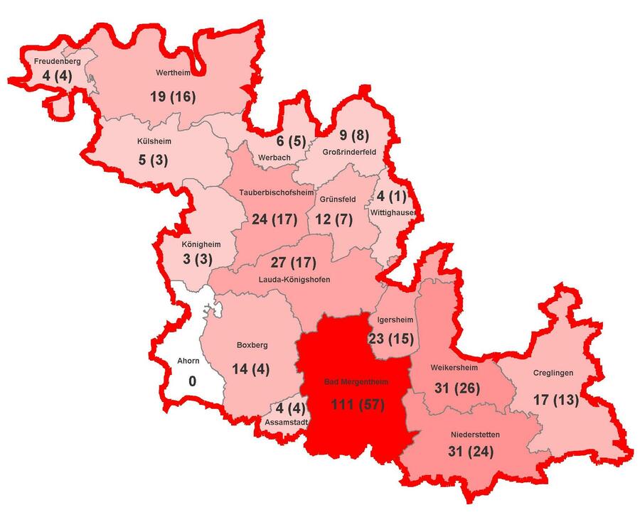 Die 344 Fälle verteilen sich auf das Gebiet der Kommunen Ahorn: 0, Assamstadt: 4, Bad Mergentheim: 111, Boxberg: 14, Creglingen: 17, Freudenberg: 4, Großrinderfeld: 9, Grünsfeld: 12, Igersheim: 23, Külsheim: 5, Königheim: 3, Lauda-Königshofen: 27, Niederstetten: 31, Tauberbischofsheim: 24 (+1), Weikersheim: 31, Werbach: 6, Wertheim: 19 und Wittighausen: 4.