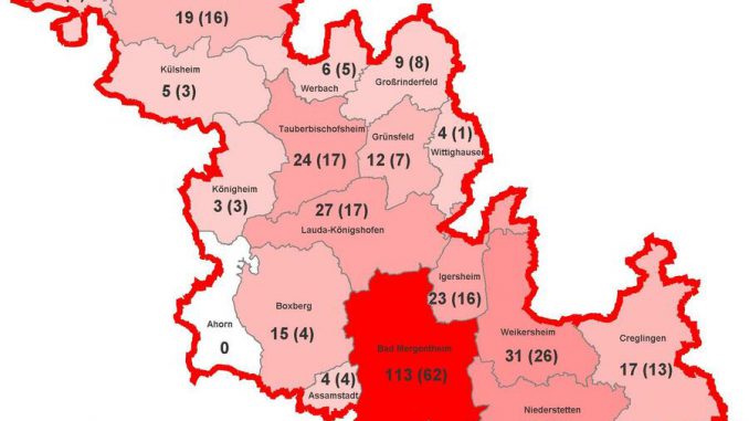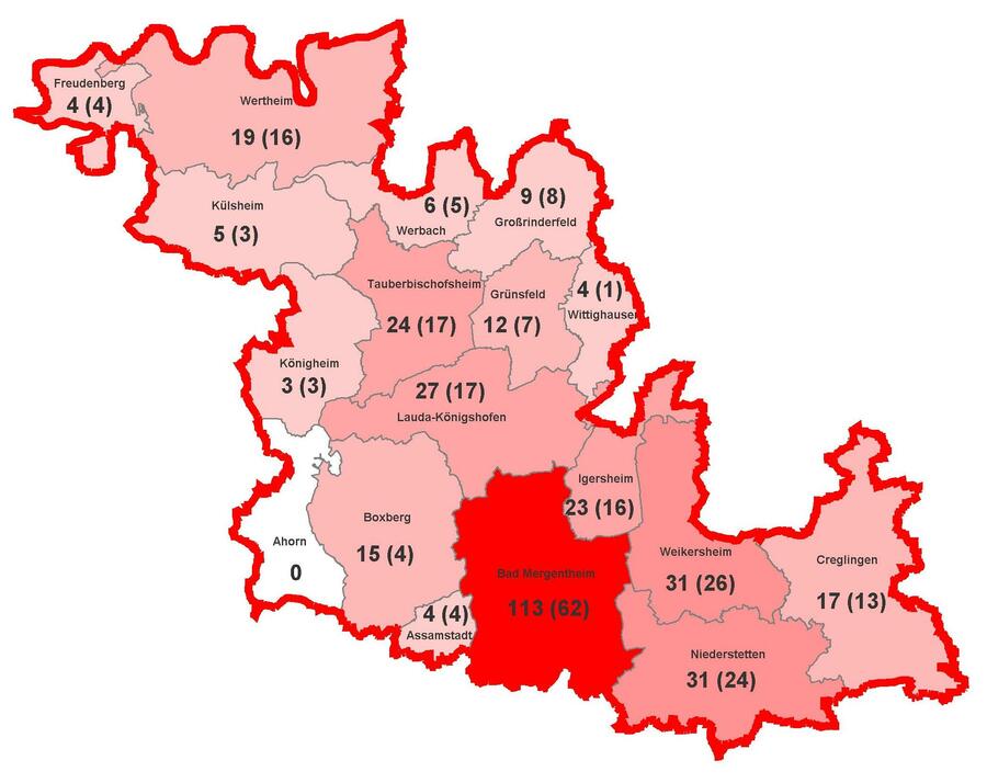 Die 347 Fälle verteilen sich auf das Gebiet der Kommunen Ahorn: 0, Assamstadt: 4, Bad Mergentheim: 113 (+2), Boxberg: 15 (+1), Creglingen: 17, Freudenberg: 4, Großrinderfeld: 9, Grünsfeld: 12, Igersheim: 23, Külsheim: 5, Königheim: 3, Lauda-Königshofen: 27, Niederstetten: 31, Tauberbischofsheim: 24, Weikersheim: 31, Werbach: 6, Wertheim: 19 und Wittighausen: 4.