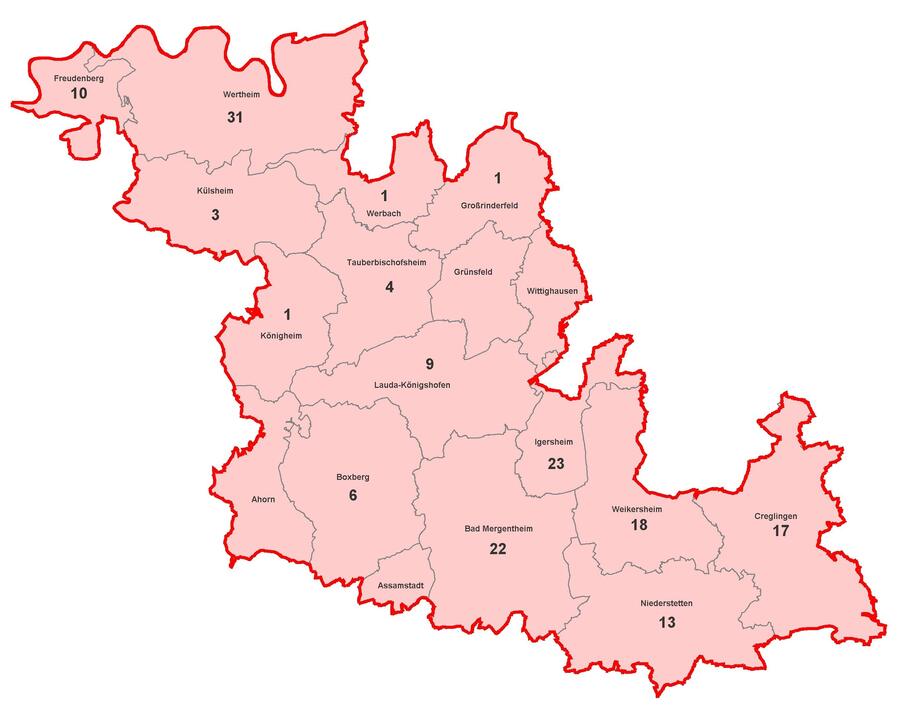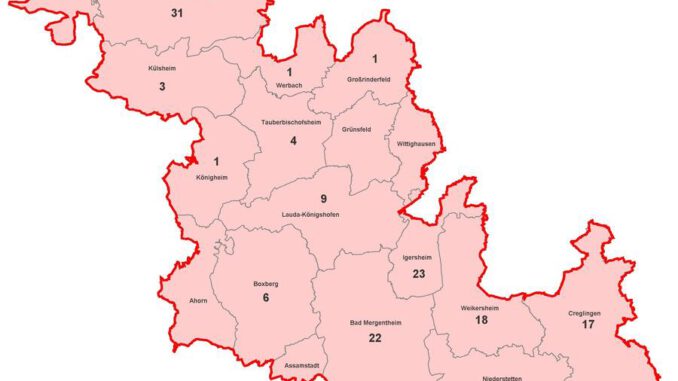 Derzeit sind 159 Personen aktiv von einer nachgewiesenen Infektion betroffen. Diese Fälle verteilen sich auf das Gebiet der Kommunen (Zahl neuer Fälle jeweils in Klammern): Ahorn: 0, Assamstadt: 0, Bad Mergentheim: 22 (+4), Boxberg: 6, Creglingen: 17 (+1), Freudenberg: 10 (+6), Großrinderfeld: 1, Grünsfeld: 0, Igersheim: 23 (+2), Königheim: 1 (+1), Külsheim: 3, Lauda-Königshofen: 9 (+1), Niederstetten: 13, Tauberbischofsheim: 4 (+1), Weikersheim: 18 (+1), Werbach: 1, Wertheim: 31 (+2) und Wittighausen: 0.