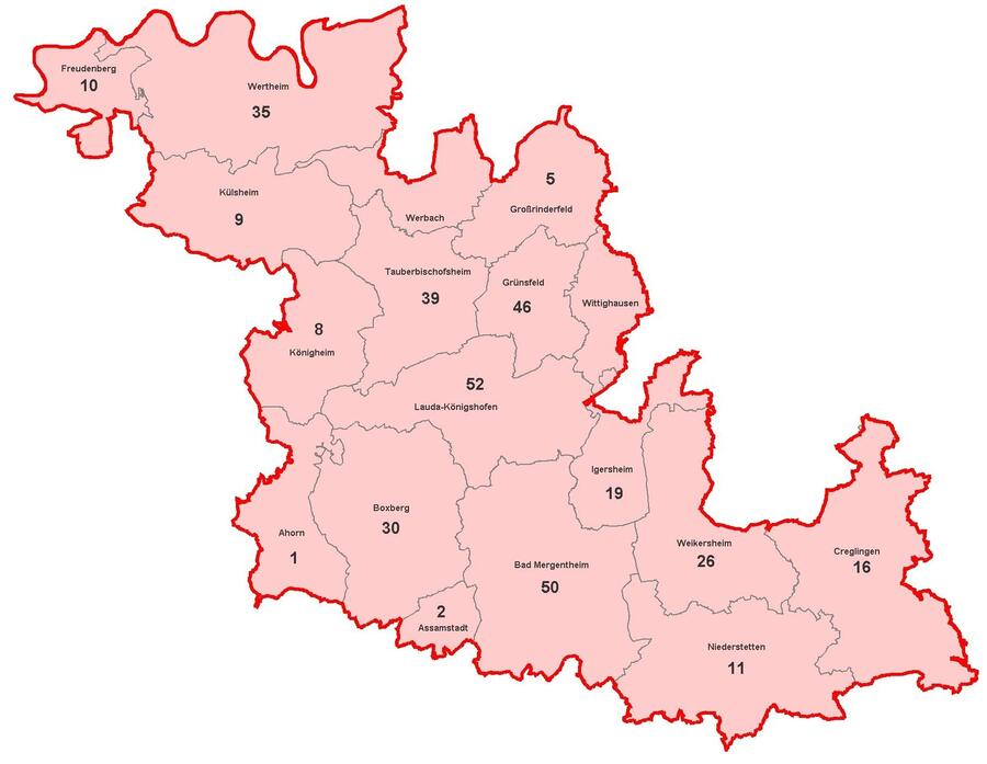 Inzwischen sind 25 weitere und damit insgesamt 3372 Personen wieder genesen. Damit sind derzeit 359 Personen aktiv von einer nachgewiesenen Infektion betroffen. Diese Fälle verteilen sich auf das Gebiet der Kommunen (Zahl neuer Fälle jeweils in Klammern): Ahorn: 1, Assamstadt: 2 (+1), Bad Mergentheim: 50 (+3), Boxberg: 30 (+2), Creglingen: 16, Freudenberg: 10 (+3), Großrinderfeld: 5 (+1), Grünsfeld: 46, Igersheim: 19 (+1), Königheim: 8, Külsheim: 9 (+1), Lauda-Königshofen: 52 (+6), Niederstetten: 11, Tauberbischofsheim: 39 (+5), Weikersheim: 26, Werbach: 0, Wertheim: 35 (+8) und Wittighausen: 0.
