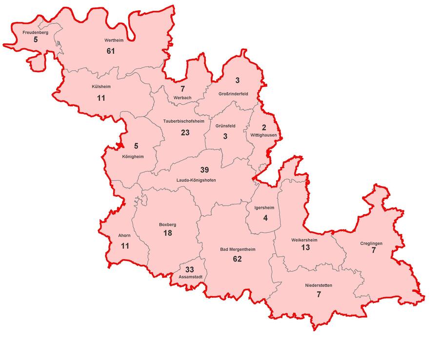 Mittlerweile sind 26 weitere und damit insgesamt 1716 Personen wieder genesen. Derzeit sind 314 Personen aktiv von einer nachgewiesenen Infektion betroffen. Diese Fälle verteilen sich auf das Gebiet der Kommunen (Zahl neuer Fälle jeweils in Klammern): Ahorn: 11, Assamstadt: 33 (+7), Bad Mergentheim: 62 (+19), Boxberg: 18 (+5), Creglingen: 7 (+3), Freudenberg: 5, Großrinderfeld: 3, Grünsfeld: 3, Igersheim: 4, Königheim: 5, Külsheim: 11, Lauda-Königshofen: 39 (+15), Niederstetten: 7 (+3), Tauberbischofsheim: 23 (+5), Weikersheim: 13 (+7), Werbach: 7 (+1), Wertheim: 61 (+13) und Wittighausen: 2.