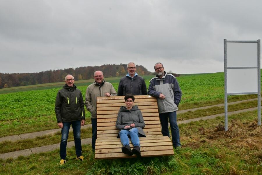 „Von hier hat man einen wunderbaren Blick auf unser Dorf“, sagte Ortsvorsteher Walter Lutz. Egal zu welcher Tageszeit, man hat immer wieder überraschende Momente, wenn man auf der Sitzliege die Seele einfach baumeln lässt. Diese Holzliege und eine Informationstafel über Besonderheiten entlang der Wander- und Radwege stellen bei allen 20 Orten des Glücks das verbindende Element dar. In Großrinderfeld kann man davon sogar drei genießen – am Schneeberg, am Häusemer Berg mit herrlichem Blick bis in den Spessart und an der Leschelücke mit Aussicht auf das fränkische Ackerland bis nach Poppenhausen.