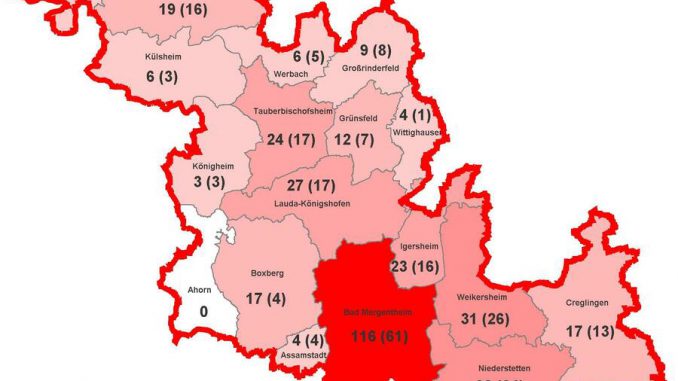 Die 354 Fälle verteilen sich auf das Gebiet der Kommunen Ahorn: 0, Assamstadt: 4, Bad Mergentheim: 116 (+1), Boxberg: 17, Creglingen: 17, Freudenberg: 4, Großrinderfeld: 9, Grünsfeld: 12, Igersheim: 23, Külsheim: 6 (+1), Königheim: 3, Lauda-Königshofen: 27, Niederstetten: 32, Tauberbischofsheim: 24, Weikersheim: 31, Werbach: 6, Wertheim: 19 und Wittighausen: 4.