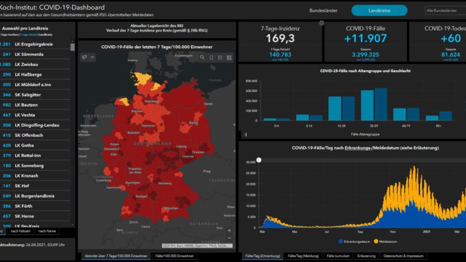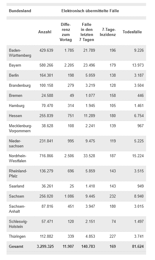 Außerdem stellt das RKI eine Gesamtübersicht der pro Tag ans RKI übermittelten Fälle und Todesfälle sowie die 7-Tage-Inzidenzen auf Kreisebene im Excelformat zur Verfügung (Tabelle wird arbeitstäglich aktualisiert).
