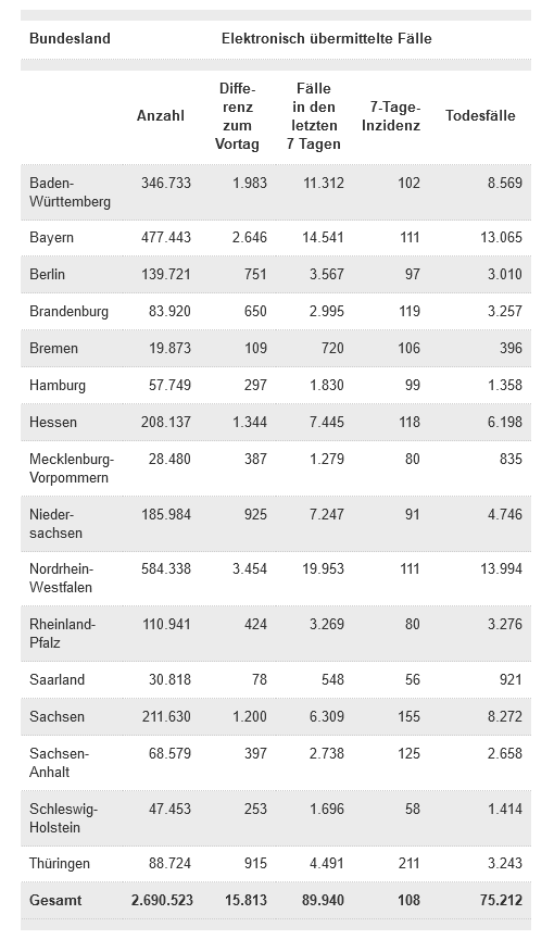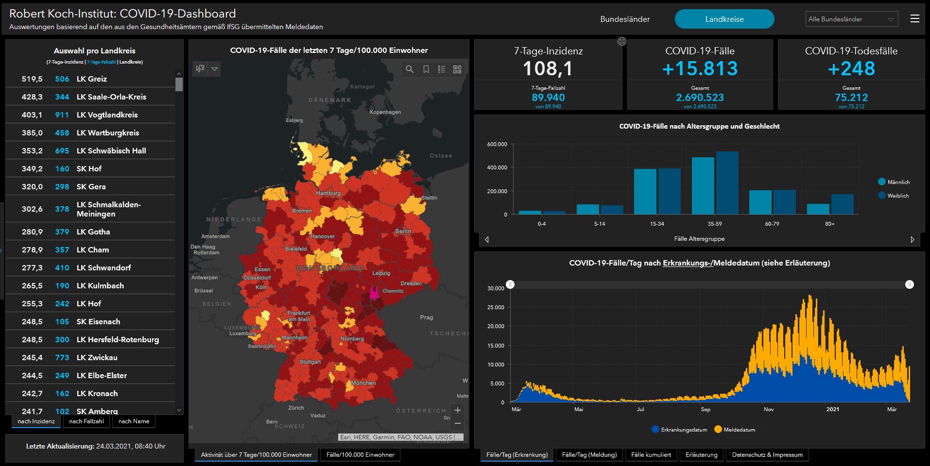 RKI meldet 15813 Neuinfektionen in Deutschland – 248 Todesfälle – 7-Tage-Inzidenz 108,1 – Bundesländerliste – Stand 24.03.2021