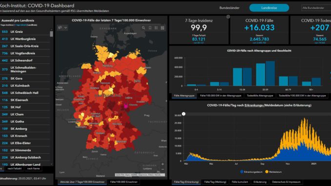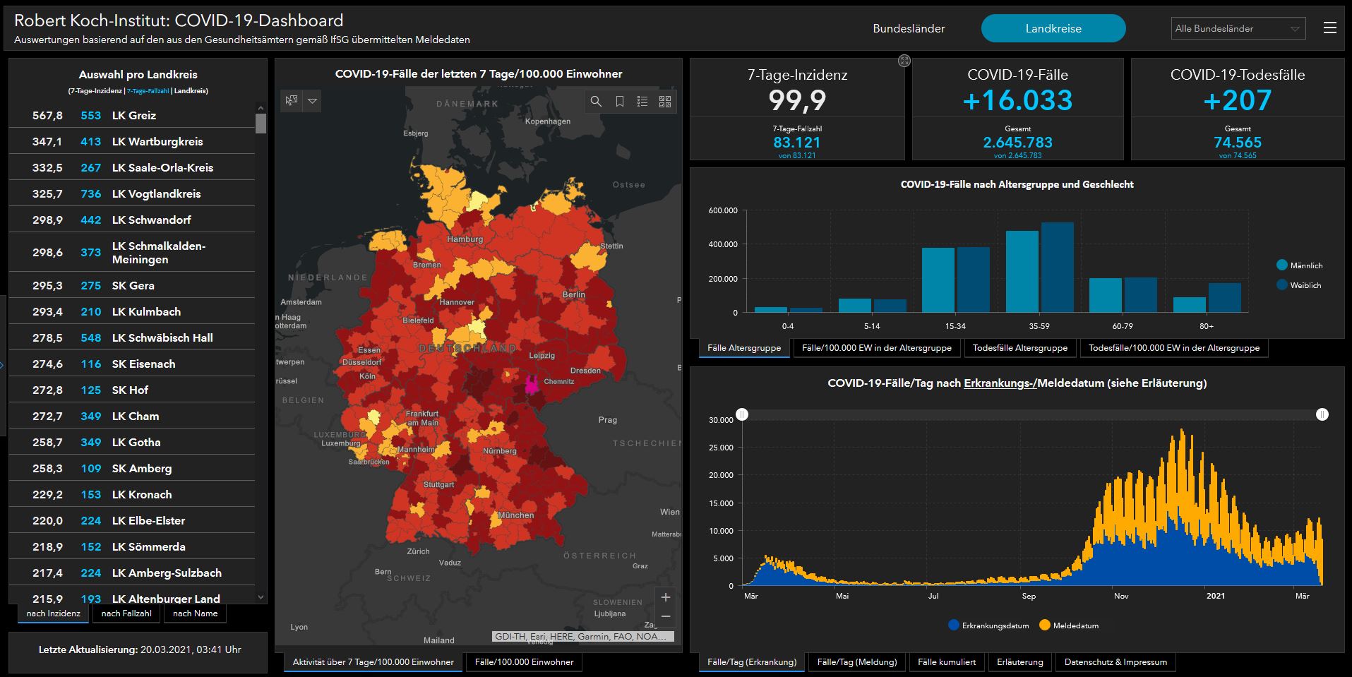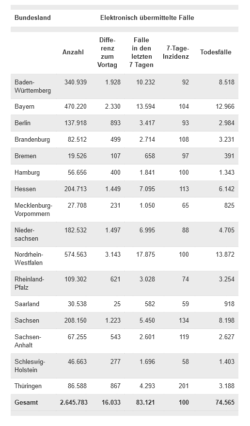 Außerdem stellt das RKI eine Gesamtübersicht der pro Tag ans RKI übermittelten Fälle und Todesfälle sowie die 7-Tage-Inzidenzen auf Kreisebene im Excelformat zur Verfügung (Tabelle wird werktäglich aktualisiert).