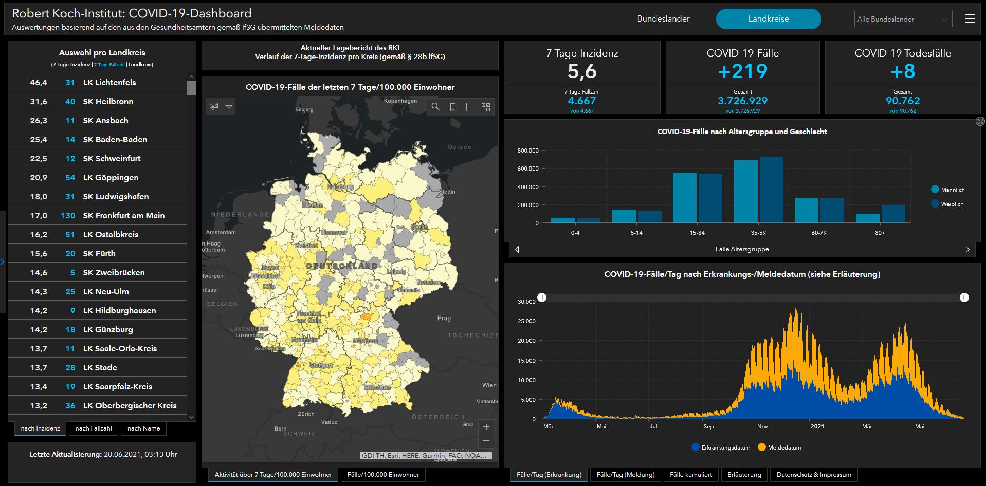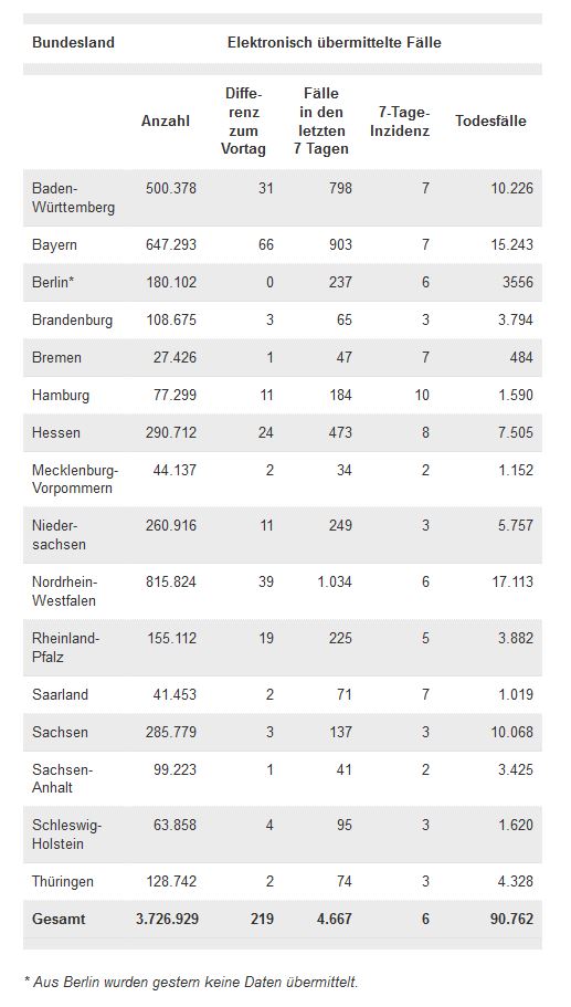 Außerdem stellt das RKI eine Gesamtübersicht der pro Tag ans RKI übermittelten Fälle und Todesfälle sowie die 7-Tage-Inzidenzen auf Kreisebene (gemäß „Bundesnotbremse“) im Excelformat zur Verfügung.