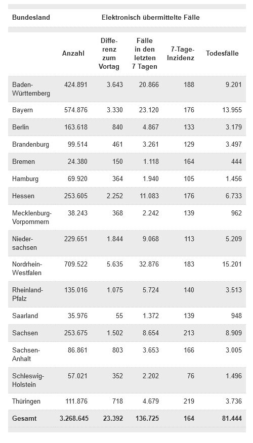 Außerdem stellt das RKI eine Gesamtübersicht der pro Tag ans RKI übermittelten Fälle und Todesfälle sowie die 7-Tage-Inzidenzen auf Kreisebene im Excelformat zur Verfügung (Tabelle wird arbeitstäglich aktualisiert).