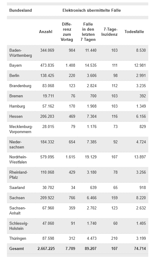 Außerdem stellt das RKI eine Gesamtübersicht der pro Tag ans RKI übermittelten Fälle und Todesfälle sowie die 7-Tage-Inzidenzen auf Kreisebene im Excelformat zur Verfügung (Tabelle wird werktäglich aktualisiert).